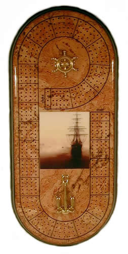 "The water's risin', rain forests disappearing - not a good thing. Well, after you've made your donation to RAN.org [Rainforest Action Network], may as well play a game of crib on en eco-friendly * laminated cork cribbage board. And, since the water's risin', we've gone with a nautical theme for this board. Included are 4 pair of jewel pegs [note your choice on the order form], soft flannel bag, full felt bottom and a dozen of our standard pegs. Nice gift we think."